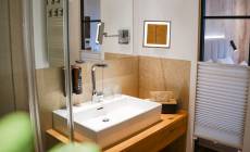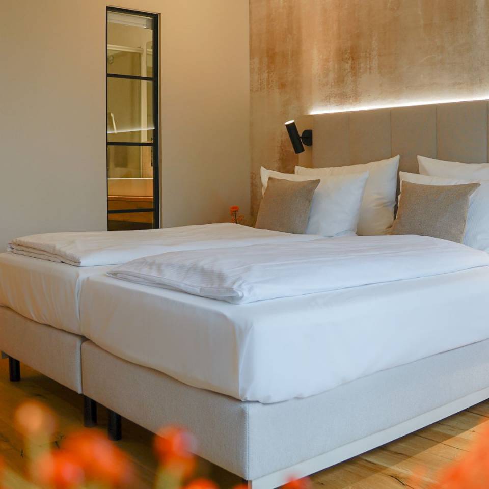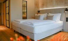 Lots of wood, soft light, and clear lines create an atmosphere that offers tranquility. The generous windows with a seating niche bring the vineyards almost to the bed. A special detail: The bathroom with a viewing window into the room – for an open view without sacrificing privacy.